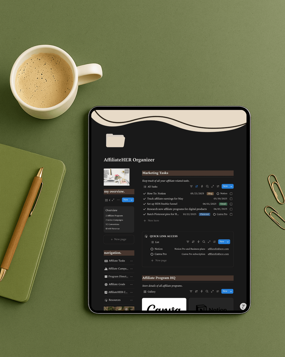Stop juggling spreadsheets, sticky notes, and scattered links. AffiliateHER Organizer puts everything you need to run a profitable affiliate marketing business in one beautiful, organized hub.