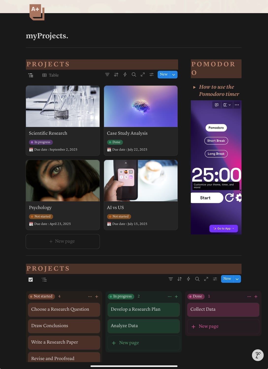 • Projects Hub – Manage research plans, essays, and group projects with built-in progress tracking.