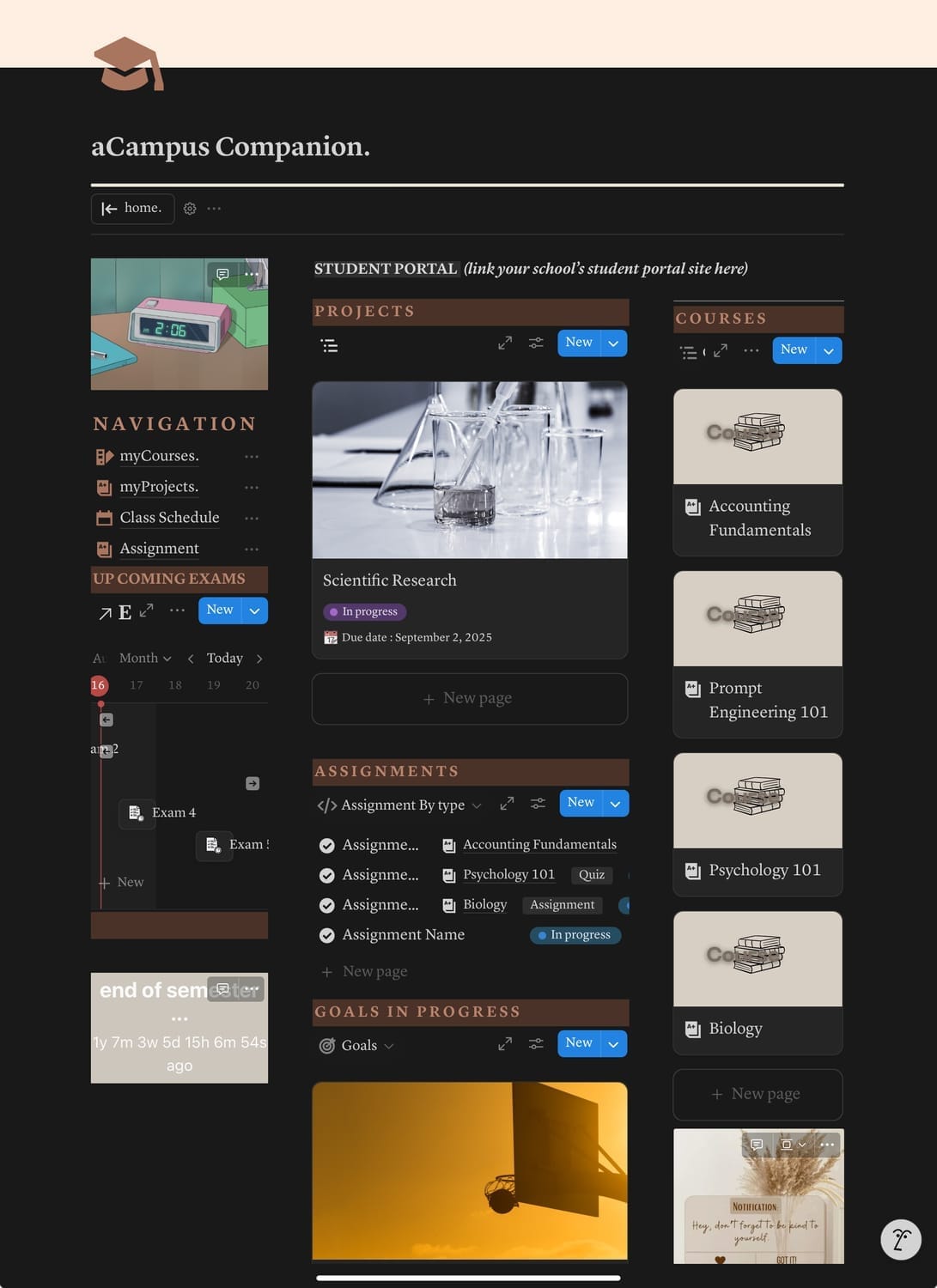 The Campus Companion isn’t just a planner, it’s your all-in-one digital hub for mastering college life with clarity, balance, and efficiency. Designed inside Notion, this system helps you stay on top of classes, assignments, exams, and projects while giving you space to track personal goals and achievements.