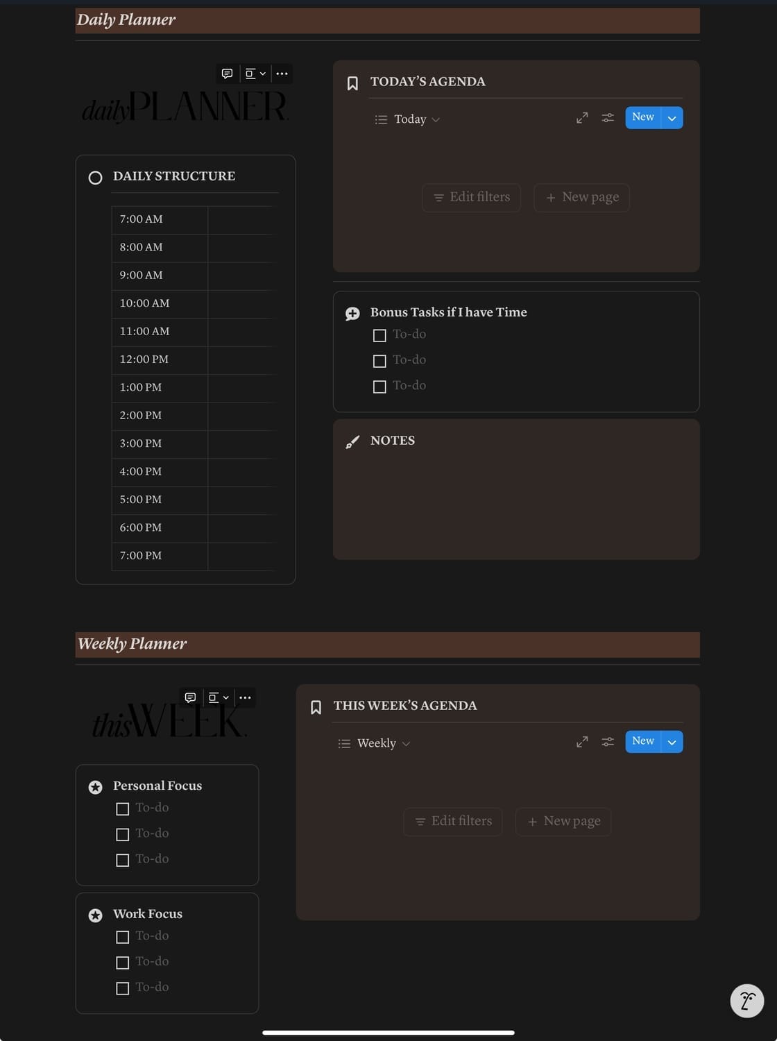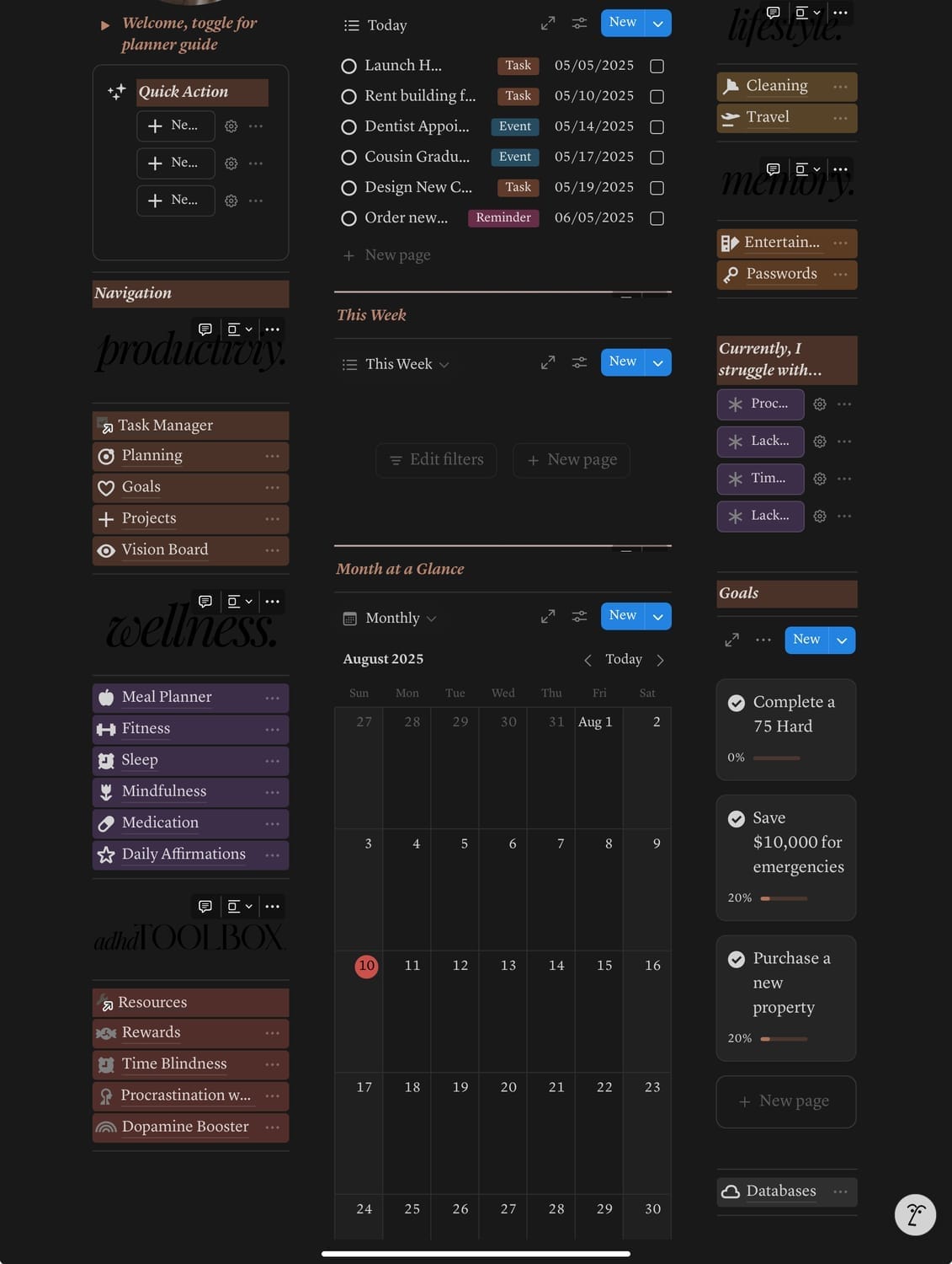 From big-picture goals to the tiny-but-important daily to-dos, every section is designed to work with your brain, not against it. Toggle between minimalist overviews and detailed dashboards, and enjoy a clear, calming layout that keeps you on track while giving you the freedom to shift gears when inspiration strikes.